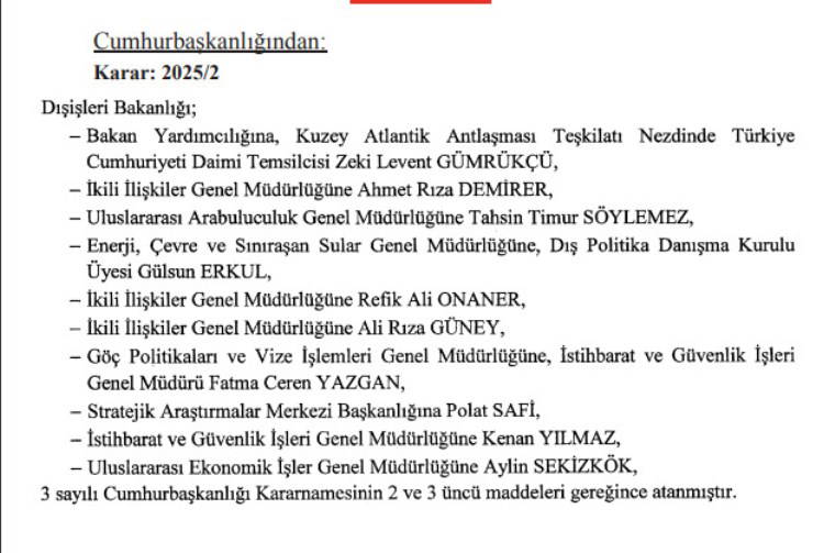 Dışişleri Bakan Yardımcılığına Zeki Levent Gümrükçü atandı. Dışişleri Bakanlığı'na yapılan diğer atamalar ise şu şekilde yer aldı: