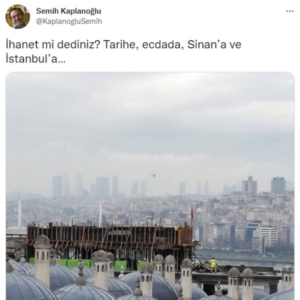 Kaplanoğu, Twitter hesabından yaptığı açıklamada "İhanet mi dediniz? Tarihe, ecdada, Sinan’a ve İstanbul’a…" dedi.