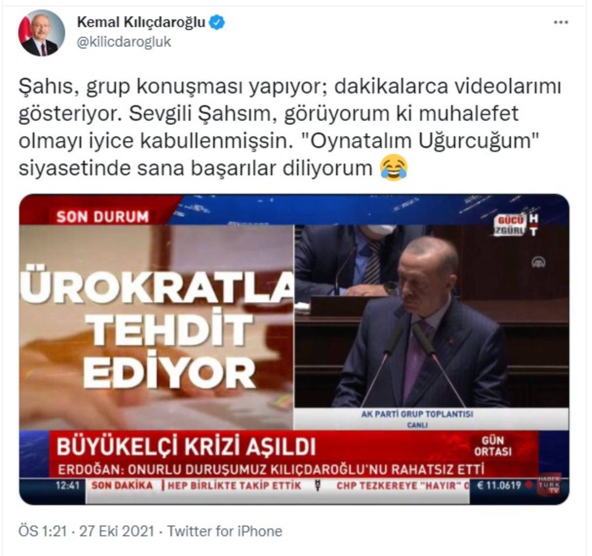 Kılıçdaroğlu mesajında, "Şahıs, grup konuşması yapıyor; dakikalarca videolarımı gösteriyor. Sevgili Şahsım, görüyorum ki muhalefet olmayı iyice kabullenmişsin. 'Oynatalım Uğurcuğum' siyasetinde sana başarılar diliyorum" ifadelerine yer verdi.
