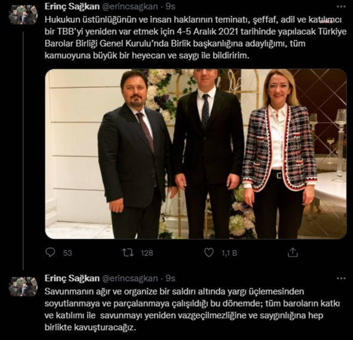 TBB’nin 4-5 Aralık 2021 tarihinde Ankara’da yapılacak genel kurulunda mevcut başkan Metin Feyzioğlu’nun karşısına çıkacak isim belli oldu. Baro başkanlarının ‘çoklu baro’ yasasına karşı yaptığı eylemde aktif rol alan Ankara Baro Başkanı Erinç Sağkan, sosyal medya hesabından yaptığı açıklamada TBB Başkanlığı’na adaylığını duyurdu.