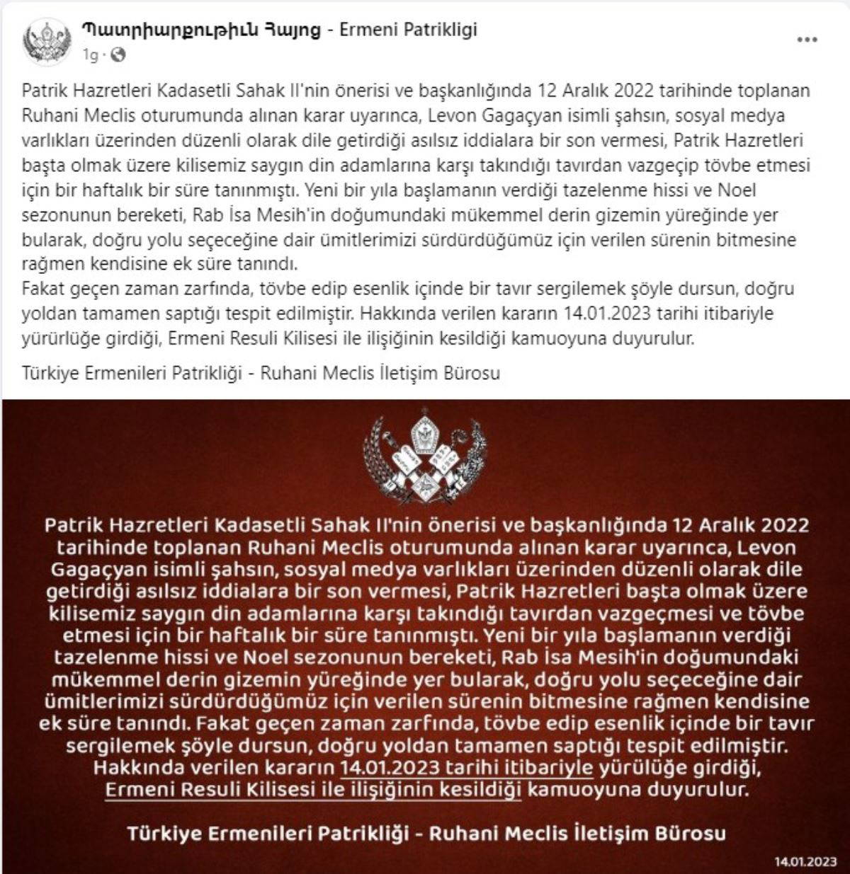 “Levon Gagaçyan isimli şahsın, sosyal medya varlıkları üzerinden düzenli olarak dile getirdiği asılsız iddialara bir son vermesi, Patrik Hazretleri başta olmak üzere kilisemiz saygın din adamlarına karşı takındığı tavırdan vazgeçmesi ve tövbe etmesi için bir haftalık süre tanınmıştı. Yeni bir yıla başlamanın verdiği tazelenme hissi ve Noel sezonunun bereketi, Rab İsa Mesih’in doğumundaki mükemmel derin gizemin yüreğinde yer bularak, doğru yolu seçeceğine dair ümitlerimizi sürdürdüğümüz için verilen sürenin bitmesine rağmen kendisine ek süre tanındı. Ama geçen zaman zarfında, tövbe edip esenlik içinde bir tavır sergilemek şöyle dursun, doğru yoldan tamamen saptığı tespit edildi. 14 Ocak itibarıyla Ermeni Resuli Kilisesi ile ilişiğinin kesildiği kamuoyuna duyurulur.”