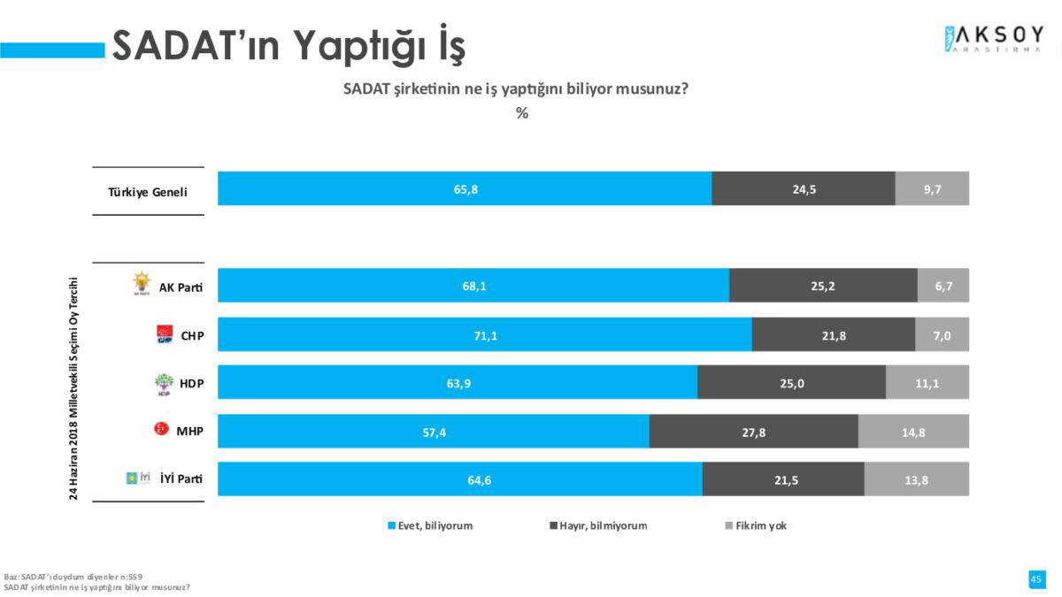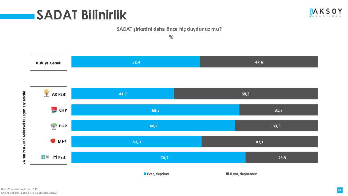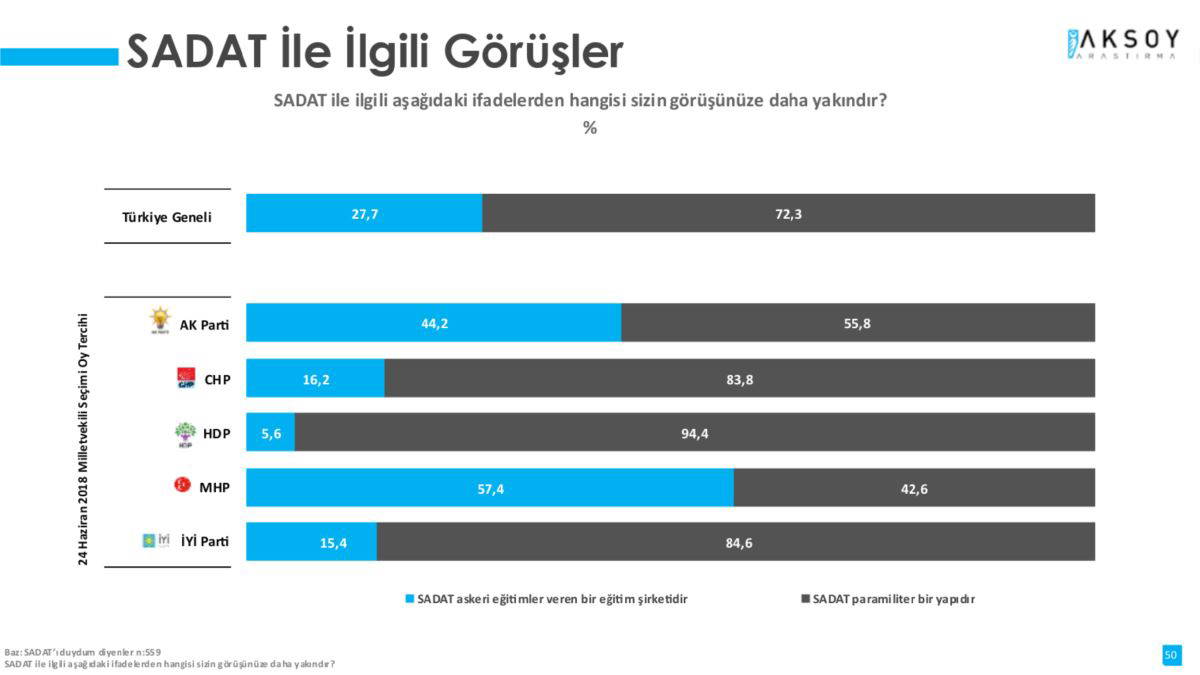 Sonuçlar bize gösteriyor ki SADAT’ın kendisinin ifade ettiği gibi bir eğitim şirketi olarak görenlerin oranı yüzde 27,7’de kalıyor. Yine Sayın Kılıçdaroğlu’nun ifade ettiği gibi paramiliter bir yapı olarak görenlerin oranı ise yüzde 72,3. Üstelik paramiliter bir yapı olarak görenlerin oranı AKP seçmeninde yüzde 55,8, MHP seçmeninde yüzde 42,6.