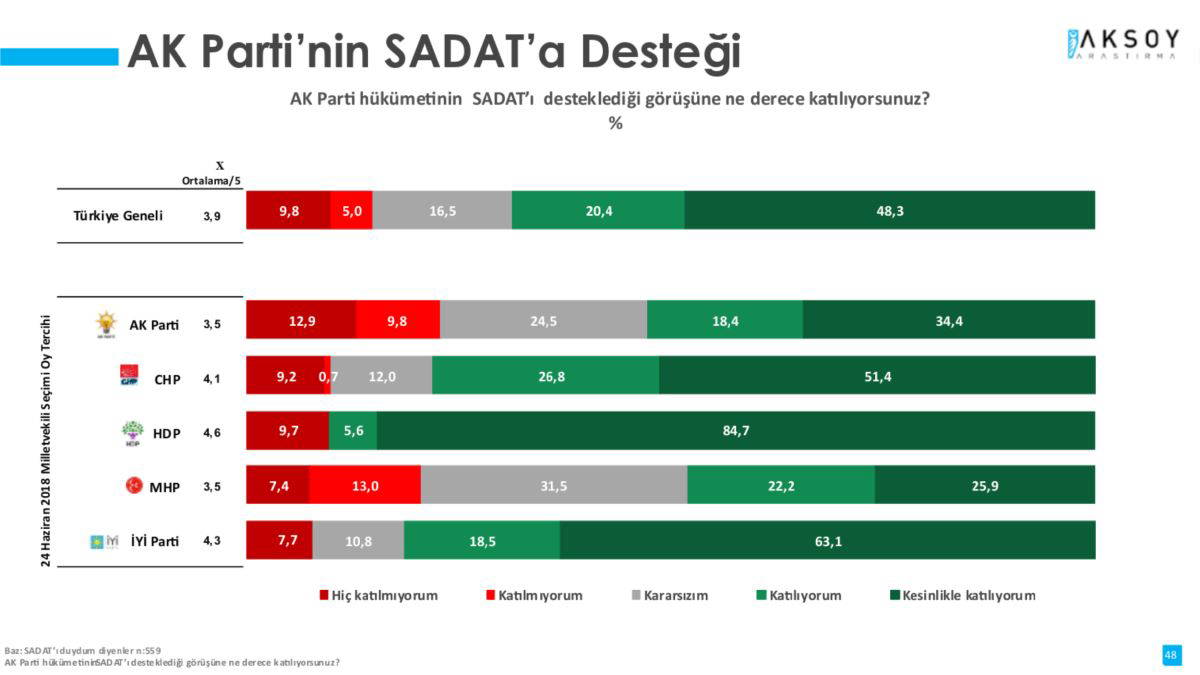 Araştırma sonuçlarına göre AKP yetkililerinin aksine toplumun yüzde 68,7’si AKP’nin SADAT’ı desteklediğini ifade ediyor. Kararsız olanları çıkardığımızda desteklemediğini düşünenlerin oranı sadece yüzde 14,8. Bu oran AKP seçmeninde yüzde 21,7, MHP seçmeninde yüzde 20,4.