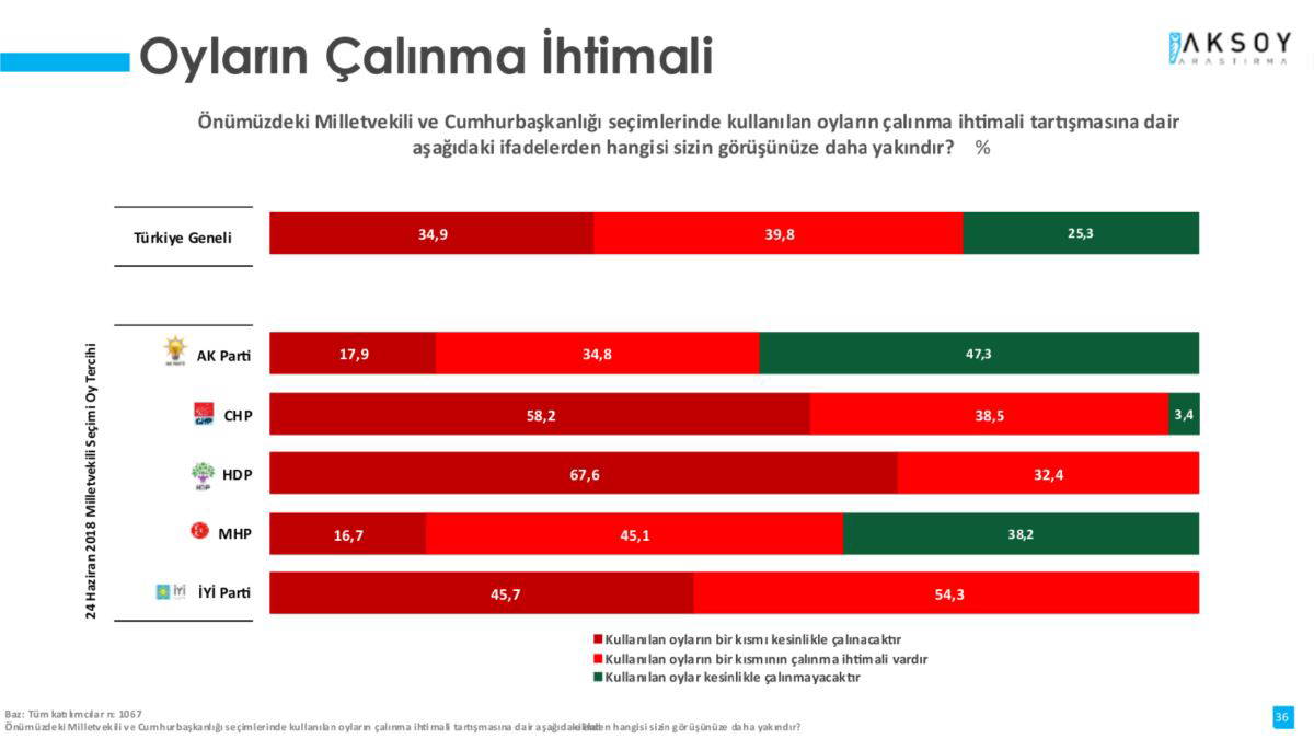 Kullanılan oyların bir kısmının kesinlikle çalınacağını düşünenlerin oranı %34,9. Kesin olmamakla birlikte çalınma ihtimali olduğunu düşünenlerin oranı ise %39,8. Kesinlikle çalınma ihtimali yoktur diyenlerin oranı %25,3. Sonuç olarak yaklaşık %75’i oyların bir kısmının çalınma ihtimali olduğuna inanıyor.