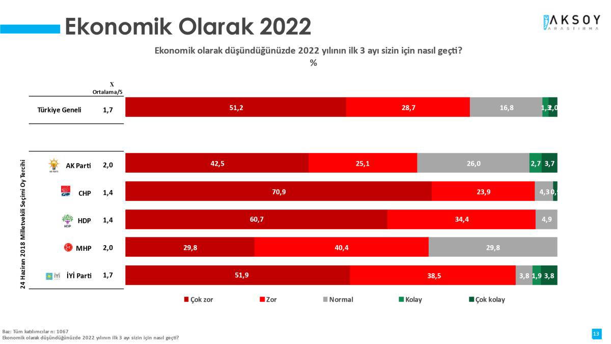 AKP’nin bu kendi ve ülke gerçekliğinden kopuşunun her geçen gün biraz daha büyüyerek devam ettiğini ve artık neredeyse politikalarının çoğunluğunun ters gerçeklik üzerine kurulduğunu gözlemliyoruz. Bu durumu en net ortaya koyan örnek ise, ülkede böylesine derin bir yoksulluk varken Suriyeli sığınmacılarının dönmeyeceği gerçeğini, salt bir söylem inatlaşması üzerine dile getirmeleriydi. Bir diğer örnek ise, toplumun büyük ekonomik sorunlarına karşı asgari ücretteki küçük artışı bir çözümmüş gibi dile getirmeleridir. Peki toplum onlar gibi bunu bir çözüm olarak görüyor mu gelin birlikte bakalım. Bu hafta yaptığımız araştırmada asgari ücret artışı sonrası dönemi anlamak için “Ekonomik olarak düşündüğünüzde 2022 yılının ilk 3 ayı sizin için nasıl geçti” diye sorduk. Yanıtlarını aşağıdaki tabloda görebilirsiniz.