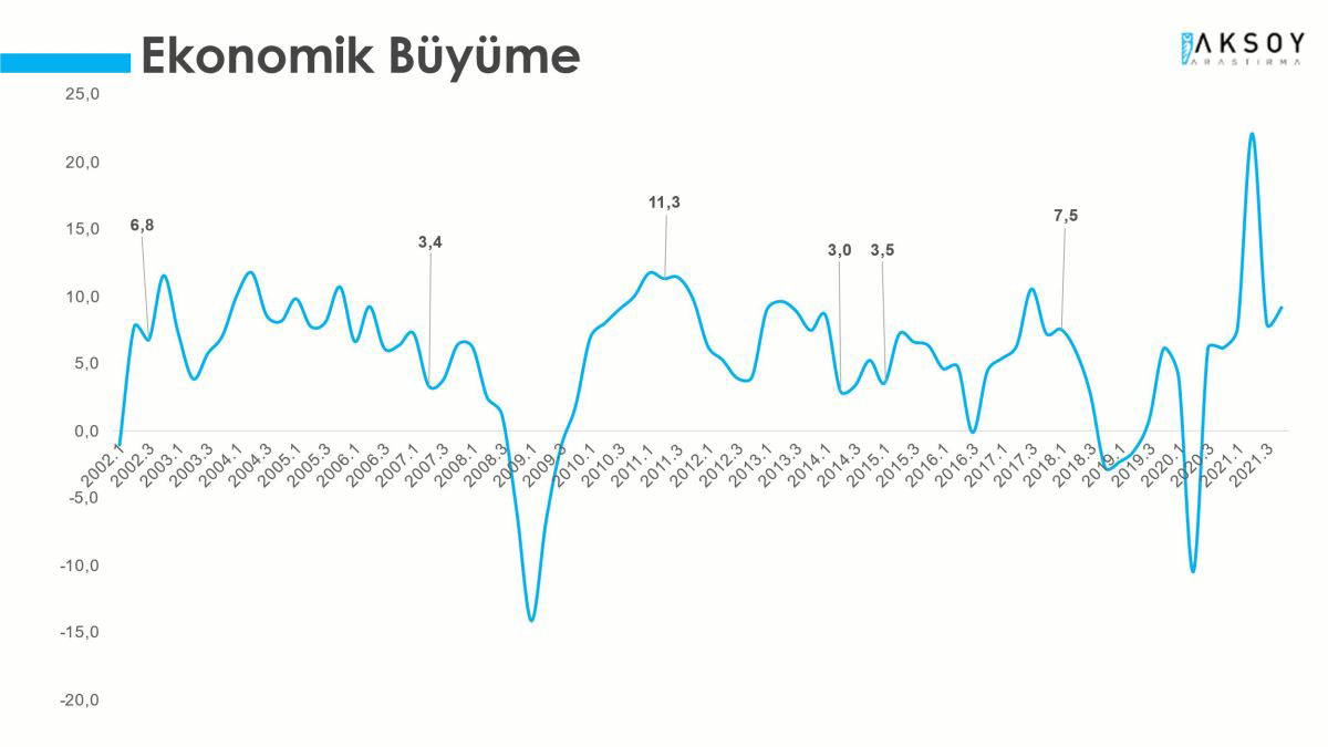 Bu durumun siyasette karşılığı, benzer hali, az gelişmiş demokrasilerin yarattığı sağ popülist liderlerle yönetilen ülkelerde sıklıkla karşımıza çıkmaktadır. Bu ülkelerdeki sağ popülist liderlerin ortak özelliği, yüksek perdeden nutuklar atmak ve kitleleri “biz” ile “onlar” olarak ikiye bölerek, tercihlerini yönetmektir. Oluşturulan “biz” ayrıcalıklıdır. Kural tanımadan, etik sınırlar umursanmadan “biz” korunur, kollanır. İhale verilir, istihdamda öncelik tanınır, sosyal yardımlar yoluyla bağımlı hale getirilir. Türkiye’de 2002 yılından bu yana, AKP ve liderinin, kutuplaştırma siyasetini dayattığı, çok da başarılı bir şekilde sahneye koyduğu hepimizin malumu. Ülkeyi kesintisiz olarak yirmi yıldır yönettiklerine göre, sonuç aldıkları da ortada. Ekonomide alt sorunların olmasına rağmen radikal bir küçülmenin olmadığı, hayat pahalılığının baskın hale gelmediği seçimlerde AKP hep kutuplaşmadan beslenerek çıktı. Aşağıdaki grafikte seçimlerden bir yıl önceki ekonomik büyüme oranlarını görebilirsiniz.
