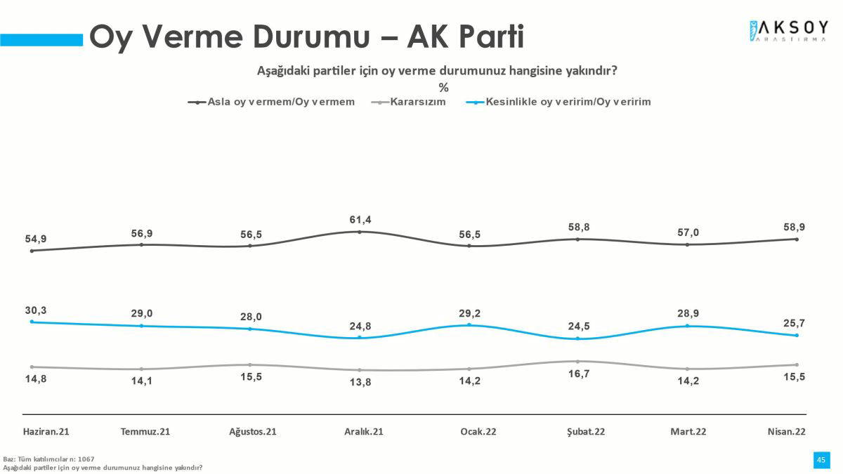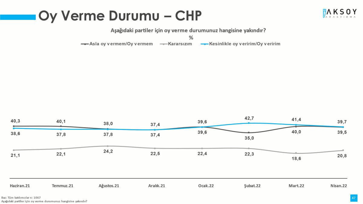 Bir süredir, özellikle kutuplaşmanın boyutunu ve kime ne tür bir etki yarattığını anlamak için belirli periyotlarla mecliste grubu bulunan partiler için tüm seçmene oy verip vermeme tercihini soruyoruz. Sonuçlara baktığımızda, “oy vermem/asla oy vermem” ifadeleri ile ölçtüğümüz karşıtlığın en düşük olduğu parti CHP’dir. Çoğumuz için şaşırtıcı gelebilecek bu sonucu CHP açısından ciddi bir başarı olarak gördüğümü belirtmek isterim. Çünkü Türkiye siyasal tarihi çok büyük oranda CHP ve sağ partilerin CHP’ye karşı yürüttüğü mücadeleden oluşur. Sağın, karşısında tek hedef olarak gördüğü ve mücadele ettiği CHP, 100. yılına giderken en düşük seçmen karşıtlığına sahiptir. Bunun ne kadar önemli bir başarı olduğunu, henüz 2017 yılında kurulan İYİ Parti’nin CHP’den yüzde 4,6 daha fazla seçmen karşıtlığına sahip olmasından da anlayabiliriz. AKP için durum nedir diye baktığımızda ise HDP’den sonraki ikinci ya da üçüncü en yüksek karşıtlığa sahip parti olduğunu görmekteyiz. (AKP üçüncü olduğunda ikinci olan MHP oluyor.) MHP ve AKP neredeyse bire bir aynı karşıtlık oranına sahip iki ortak. Aşağıdaki tablolar yakın geçmişten bugüne AKP ve CHP’nin karşıtlık oranını bize göstermektedir.