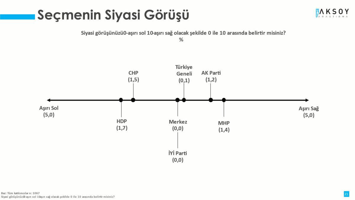 Yukarıdaki tablodan da görebileceğiniz üzere AKP ile CHP arasında anlamlı oranda karşıtlık farkı var. Bana göre bu farkı yaratan en önemli unsur, kriz döneminde AKP’nin eski ezberden yola çıkarak aşırılaşan siyaseti ile kutuplaştırmayı beslemeye çalışan tutumuna karşı, CHP’nin aynı aşırılık ile cevap vermek yerine karşısına koyduğu “makul” olanı temsil eden kapsayıcı siyaseti. Türkiye toplumunun ister sağda ister solda olsun aşırı olana karşı hep bir mesafesi var. Genel olarak uçlar yerine merkezde konumlanan siyaseti tercih ediyor. Özellikle MHP ittifakı ile birlikte net olarak aşırı siyaseti tercih eden AKP, bu tercihine seçmenini ikna etmeyi başaramadı. Aşağıdaki tablodan sonuçlarını görebileceğiniz üzere deneklere bir sağ/sol cetveli gösterdik ve aşırı sol ile aşırı sağ arasında kalan alanda kendilerini nerede gördüğünü işaretlemesini rica ettik. Onların yaptıkları işaretlemeler üzerinden her partinin tabanının ortalamasını aldık. Birlikte inceleyelim.