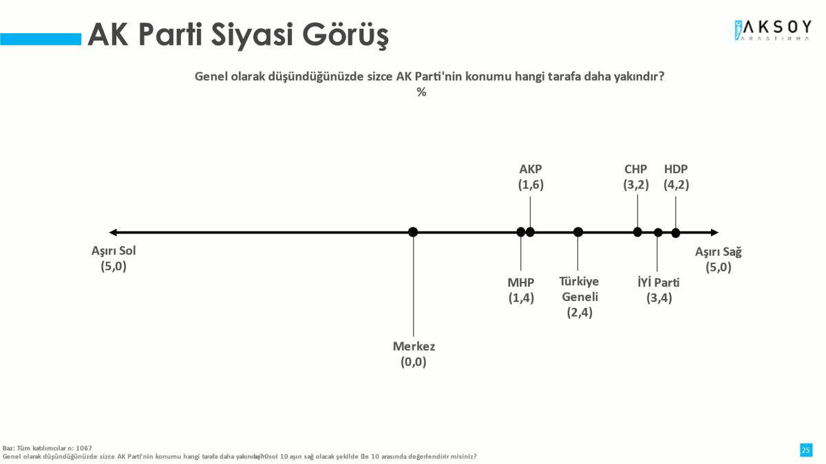 Bana göre en dikkat çekici sonuçlardan biri İYİ Parti seçmeni. Ortalamasını aldığımızda tam merkeze denk gelmektedir. Bu sonucun İYİ Parti’deki son dönem görev değişikliğine dair tartışmalara da bir katkı vereceğine inanıyorum. Buradan seçmen genelinin yanıtlarına geçtiğimizde, tüm parti tabanlarının kendilerini ağırlıklı olarak merkezin hemen sağına veya soluna yerleştirdiğini anlamaktayız. Gördüğünüz üzere aşırıya dair bir ilgi yok. Peki yine tüm seçmenlere AKP’yi nerede gördüğünü sorduğumuzda sonuç ne çıkıyor? İnceleyelim.