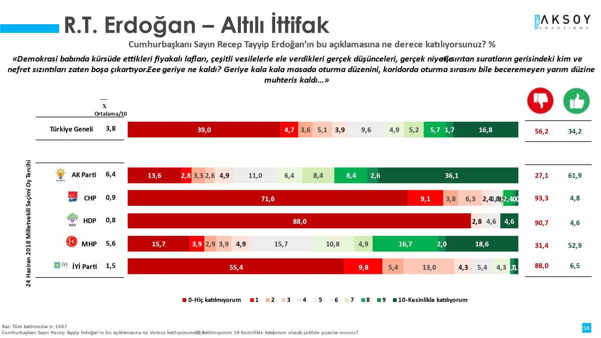 Cumhur İttifakı tabanı açısından baktığımızda güçlü sayabileceğimiz bu açıklamaya seçmenin katılımı aynı oranda güçlü değil. Katıldığını ifade edenlerin oranı yüzde 34,2. Bu oran AKP seçmeninde yüzde 61,9’da ve MHP seçmeninde yüzde 52,9’da kalmaktadır. Başka liderlerin açıklamalarının kendi tabanlarında yüzde 90 gibi bir oranla destek bulduğunu hesaba katarsak, Erdoğan’ın açıklamalarının kendi tabanında ne kadar zayıf bir karşılık bulduğunu daha iyi anlayabiliriz.