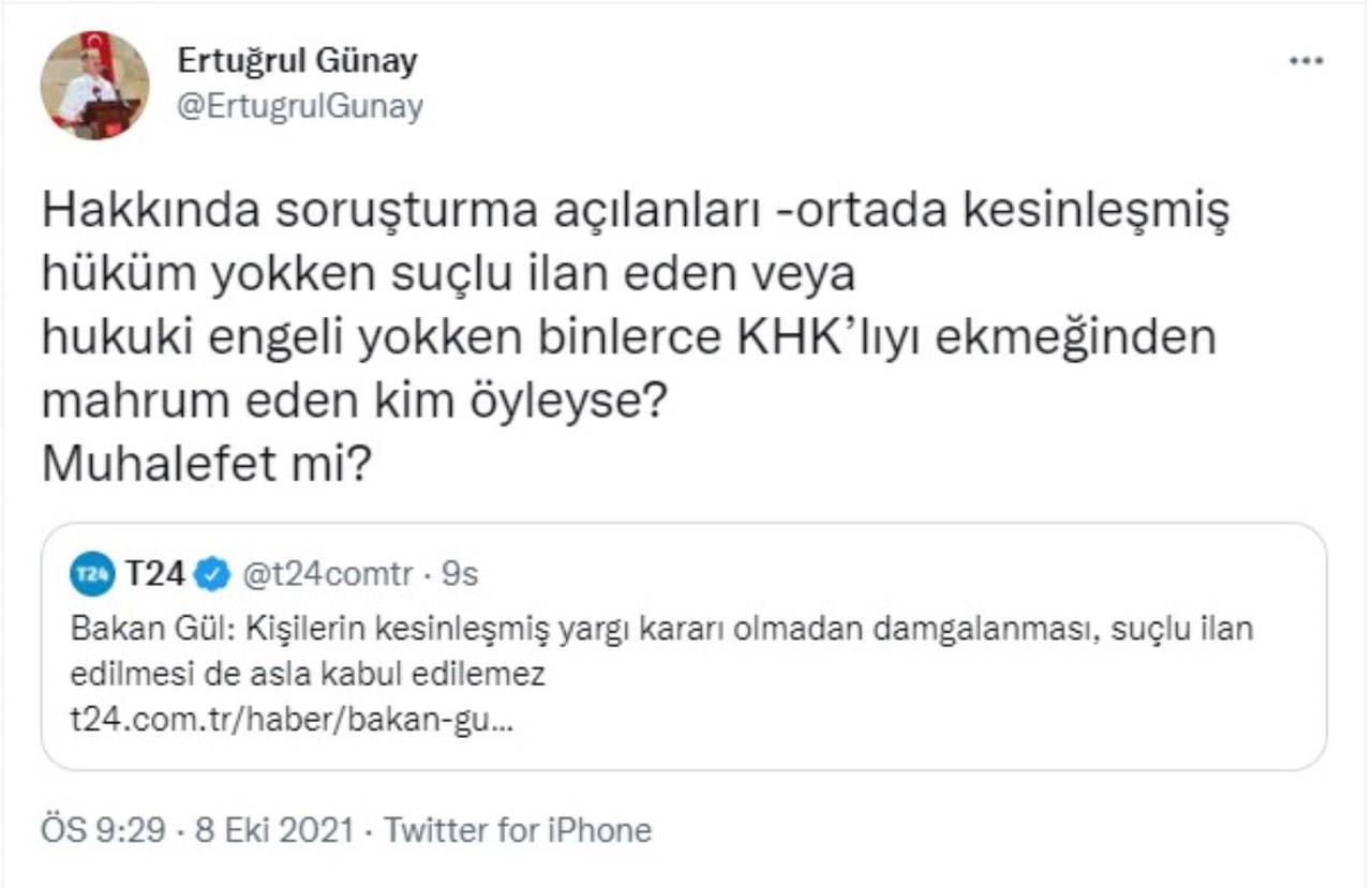 Eski Kültür ve Turizm Bakanı Ertuğrul Günay da konuya sosyal medya hesabından tepki gösterdi. Bakan Gül’ün açıklamasının olduğu tweeti alıntılayan Günay, “Hakkında soruşturma açılanları, ortada kesinleşmiş hüküm yokken suçlu ilan eden veya hukuki engeli yokken binlerce KHK’lıyı ekmeğinden mahrum eden kim öyleyse? Muhalefet mi?” diye sordu.