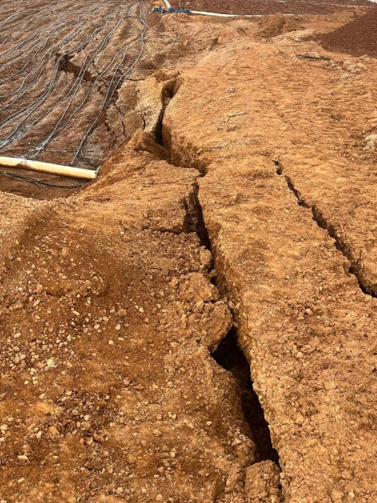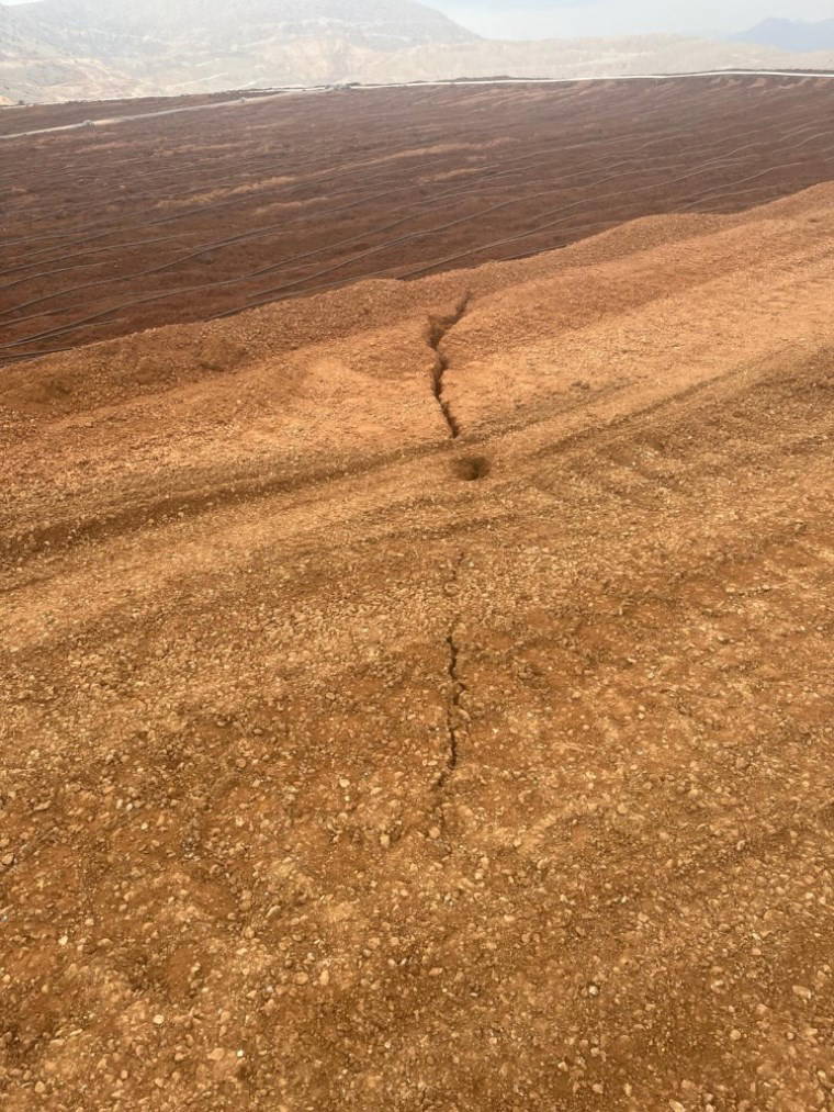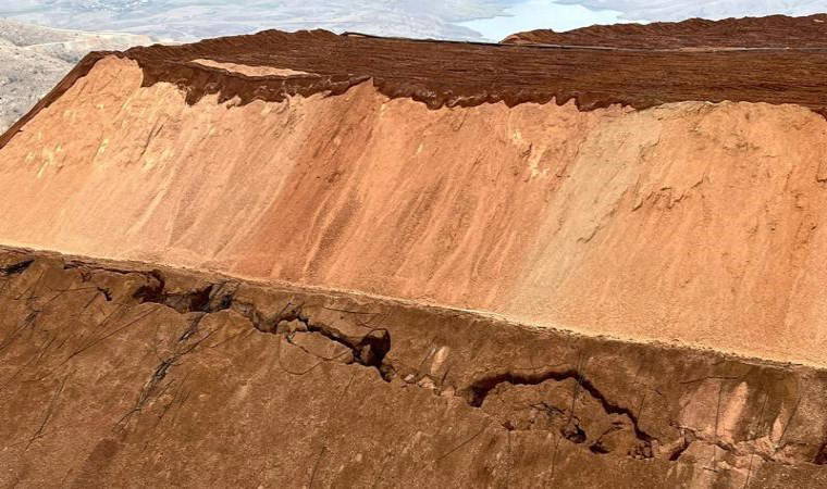 Fotoğraflarda, yığın liç alanında biriktirilen topraklarda derin yarıkların oluştuğu görülüyor.