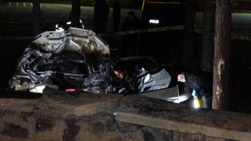 Aşırı hız nedeniyle sürücüsünün direksiyon hakimiyetini kaybettiği otomobil, önce refüje çarptı sonra da yolun karşısında bulunan Palandöken Devlet Hastanesi'nin bahçesine düştü. Çarpmanın şiddetiyle otomobil motor kısmından alev aldı.