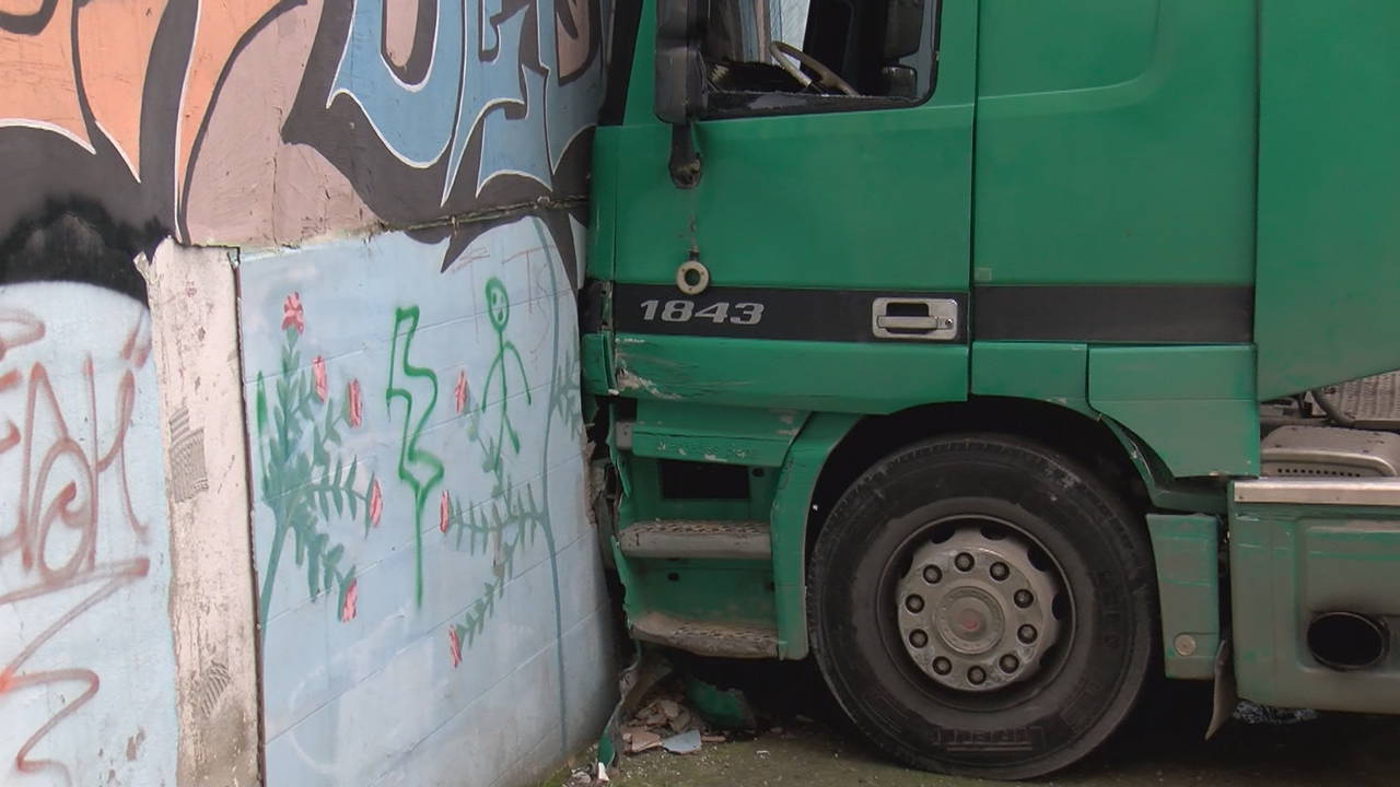 Hızla kayan hafriyat kamyonu boş alandaki demir korkulukları kırarak 4 katlı bir apartmanın duvarına çarparak durabildi.