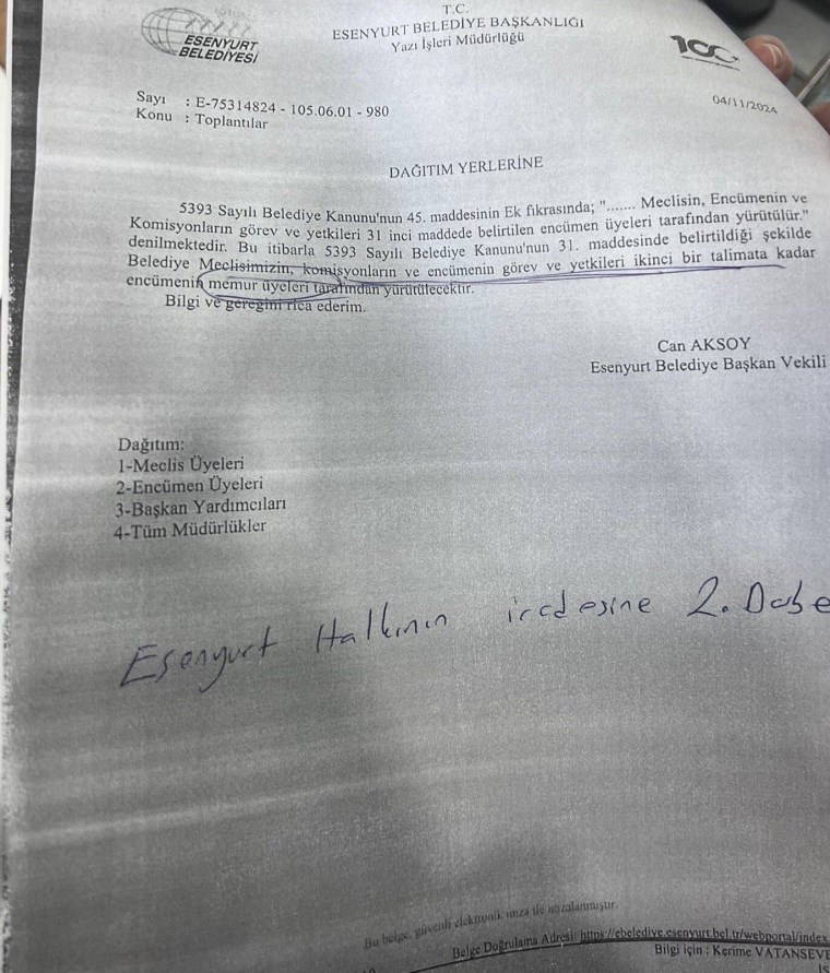Kayyum Can Aksoy imzasıyla gönderilen yazıda meclis üyelerinin görevleri memurlara devrildi. Böylelikle Esenyurt'ta 31 Mart günü sandığa giren dört zarftan ikisi yok sayıldı.