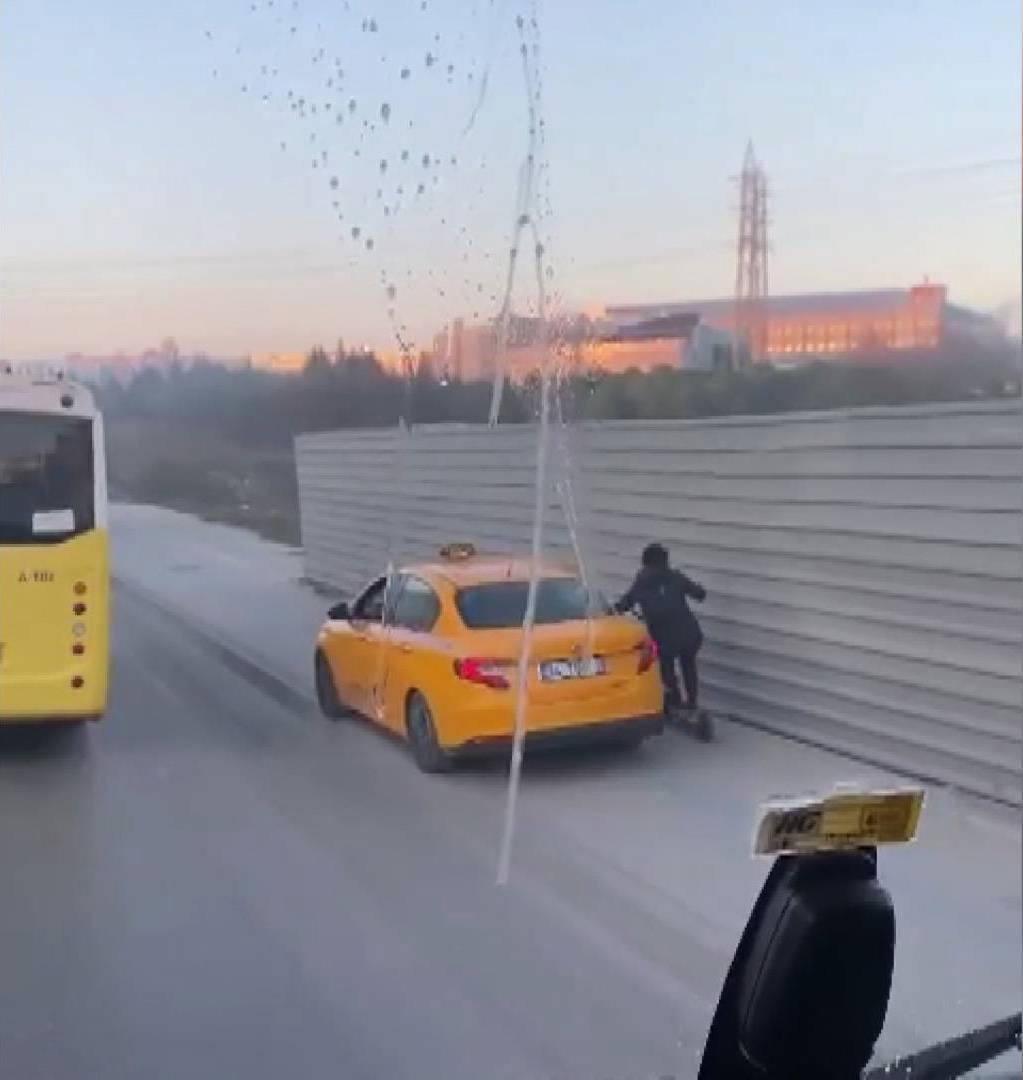 O sırada kaldırımda scooter kullanan kadına hafif bir şekilde çarpan taksici, aldırış etmeden yoluna devam etti. O anlar bir yurttaşın cep telefonu kamerasına yansıdı.