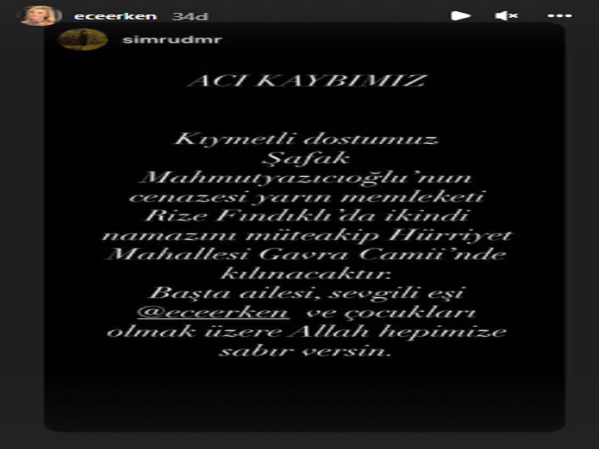 Erken’in alıntıladığı paylaşımda, ‘acı kaybımız’ başlığıyla “Kıymetli dostumuz Şafak Mahmutyazıcıoğlu’nun cenazesi memleketi Rize Fındıklı’da ikindi namazını müteakip Hürriyet Mahallesi Gavra Camii’nde kılınacaktır. Başta ailesi, sevgili eşi Ece Erken ve çocukları olmak üzere Allah hepimize sabır versin” ifadeleri yer aldı.