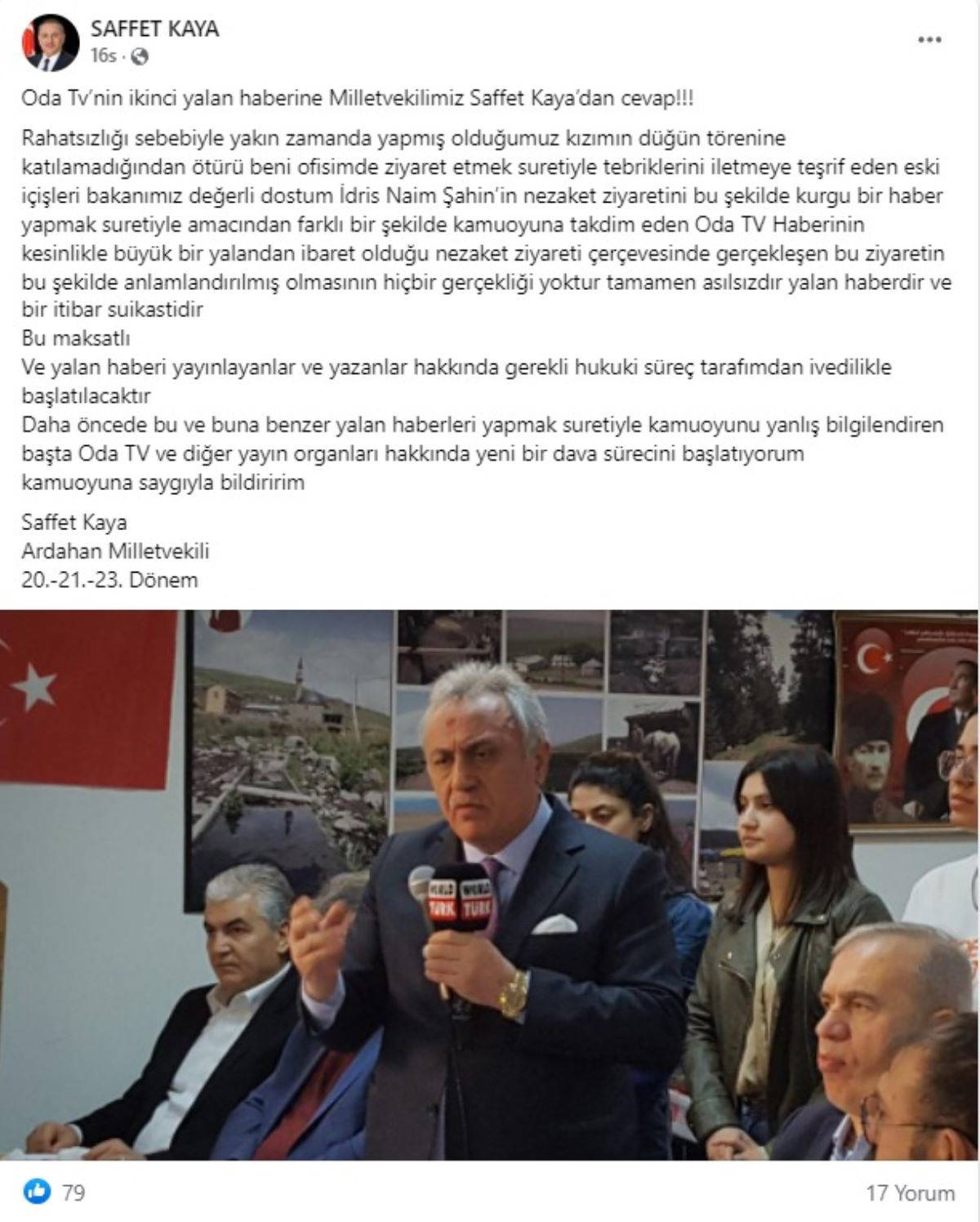 "Rahatsızlığı sebebiyle yakın zamanda yapmış olduğumuz kızımın düğün törenine katılamadığından ötürü beni ofisimde ziyaret etmek suretiyle tebriklerini iletmeye teşrif eden eski içişleri bakanımız değerli dostum İdris Naim Şahin'in nezaket ziyaretini bu şekilde kurgu bir haber yapmak suretiyle amacından farklı bir şekilde kamuoyuna takdim eden Oda TV haberinin kesinlikle büyük bir yalandan ibaret olduğu, nezaket ziyareti çerçevesinde gerçekleşen bu ziyaretin bu şekilde anlamlandırılmış olmasının hiçbir gerçekliği yoktur. Tamamen asılsızdır, yalan haberdir ve bir itibar suikastıdır.