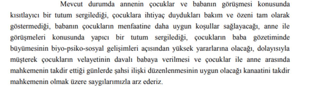 ''Çocuğun annesi tarafından ihmal edildiğine yönelik bir rapor çıktı. Bu nedenle velayet davası açtım. Uzmanlar tarafından tekrar inceleme yapıldı, mahkemenin sosyal inceleme raporu çıktı ve velayetin tarafımıza verilmesi uygun görüldü. Karşı taraf ise devletin kurumunun verdiği rapora itiraz etti. İkinci velayet raporundaki haklılığımıza karşı taraf itiraz edince üçüncü kez dosya üzerinde sosyal inceleme raporu alınması kararlaştırıldı. Raporun alınması için çocukların ve annenin kaldığı evin incelenmesi gerekiyordu, annenin devlet memuru olması ve pandemide eğitim ve öğretime ara verildiği için memurların görev mevkilerini terk etmeden izinli olduğu zamanda anne çocukları da alıp ablasının yanına, Antalya'ya gitti. Talebimiz üzerine mahkeme, heyetin Antalya'daki adreste sosyal inceleme yapmasına karar verdi. Ancak anne Antalya'daki konutu da terk etti. Biz de annenin zaman kazanmak için çocukları kaçırdığını ve raporun alınamadığını söyledik'' ifadelerini kullandı.