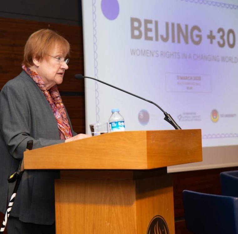 Ankara TED Üniversitesi Toplumsal Cinsiyet Çalışmaları Merkezi, Finlandiya Büyükelçiliği işbirliği ile 8 Mart Dünya Emekçi Kadınlar Günü’nü kutlamak ve Pekin Deklarasyonu’nun 30. yılını onurlandırmak amacıyla ‘Pekin+30 Değişen Dünyada Kadın Hakları’ paneli gerçekleştirdi. Panele Finlandiya’nın eski Cumhurbaşkanı Tarja Halonen, Finlandiya Büyükelçisi Pirkko Hämäläinen, Birleşmiş Milletler Nüfus Fonu (UNFPA), Birleşmiş Milletler Toplumsal Cinsiyet Eşitliği ve Kadının Güçlendirilmesi Birimi (UN Women), Birleşmiş Milletler Kalkınma Programı (UNDP), ve Uluslararası Af Örgütü’nden üst düzey temsilciler yer aldı. Etkinlikte konuşan Cumhurbaşkanı Halonen “İnsan hakları çerçevesinde kadın ve erkeklerin eşit kabul edilmesi temel bir özelliktir, ancak bu meseleler hâlâ marjinalleştiriliyor” dedi.