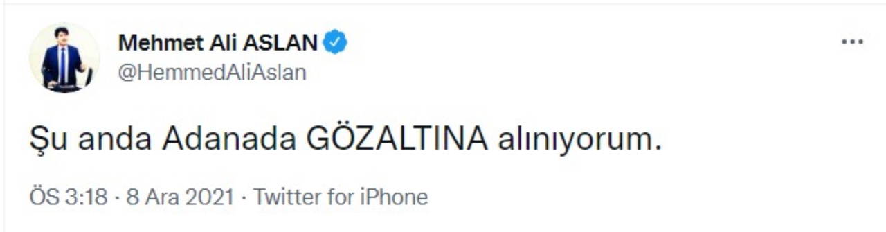 Aslan, Twitter hesabından yaptığı açıklamada, "Şu anda Adanada gözaltına alınıyorum" dedi.