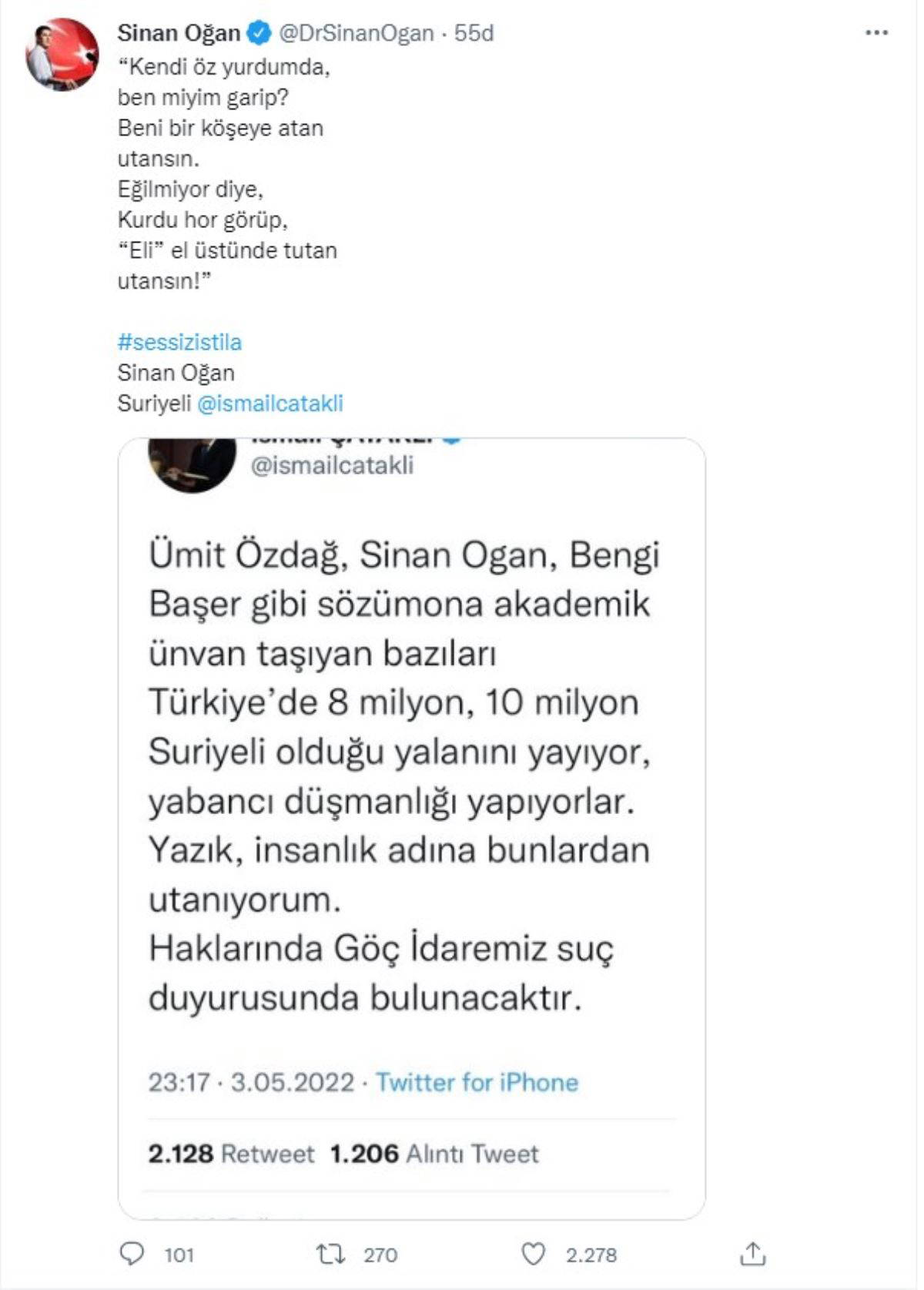 “Ümit Özdağ, Sinan Oğan, Bengi Beşer gibi sözüm ona akademik unvan taşıyan bazıları Türkiye’de 8 milyon, 10 milyon Suriyeli olduğu yalanını yayıyor, yabancı düşmanlığı yapıyor. Yazık, insanlık adına bunlardan utanıyorum. Haklarında Göç İdaremiz suç duyurusunda bulunacaktır.”
