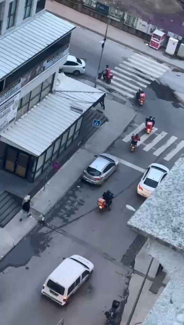 Cep telefonu kamerasına yansıyan görüntülerde iş yerlerinin camlarının çekiçle kırıldığı ve bir motokuryenin kendini görüntüleyen esnafa kask fırlattığı, yumrukla saldırdığı, bir esnafın ise motosiklete sopalarla vurduğu görüldü.