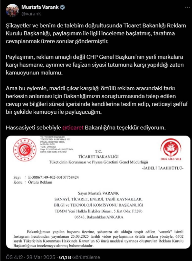 "Şikayetler ve benim de talebim doğrultusunda Ticaret Bakanlığı Reklam Kurulu Başkanlığı, paylaşımım ile ilgili inceleme başlatmış, tarafıma cevaplanmak üzere sorular göndermiştir. Paylaşımın, reklam amaçlı değil CHP Genel Başkanı'nın yerli markalara karşı hasmane, ayrımcı ve faşizan siyasi tutumuna karşı yapıldığı zaten kamuoyunun malumu.