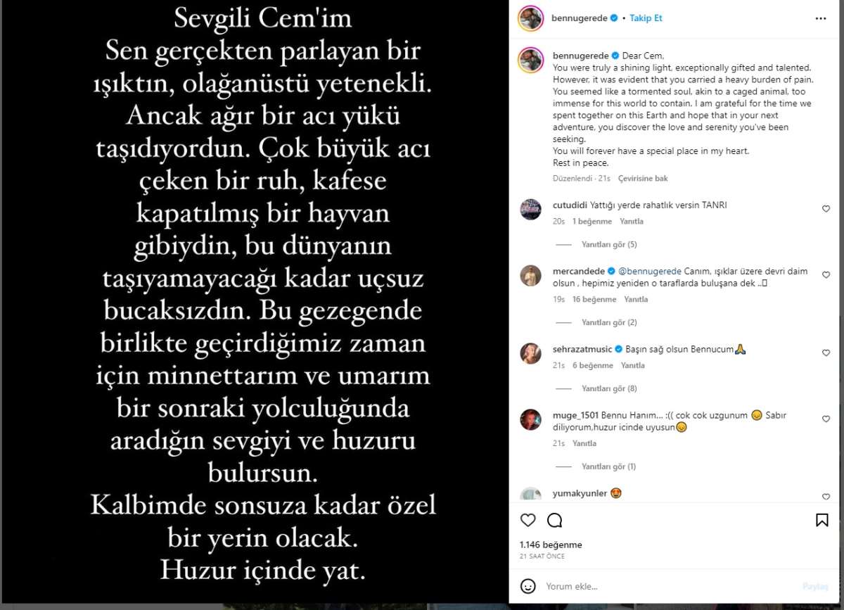 Gerede paylaşımında, "Sevgili Cem'im, Gerçekten parlayan bir ışıktın, olağanüstü yetenekli. Ancak ağır bir acı yükü taşıyordun. Çok büyük acı çeken bir ruh, kafese kapatılmış bir hayvan gibiydin, bu dünyanın taşıyamayacağı kadar uçsuz bucaksızdın. Bu gezegende birlikte geçirdiğimiz zaman için minnettarım ve umarım bir sonraki yolculuğunda aradığın sevgiyi ve huzuru bulursun. Kalbimde sonsuza kadar özel bir yerin olacak. Huzur içinde yat" ifadelerini kullandı.