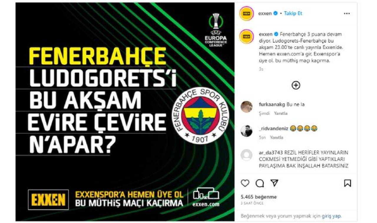 Türk takımlarının Avrupa maçları ise Acun Ilıcalı’nın sahibi olduğu Exxen yayınlıyor. Exxen bugün saat 23.00’te oynanacak Fenerbahçe maçının tanıtım paylaşımında ise cinsiyetçi bir paylaşımda bulundu.