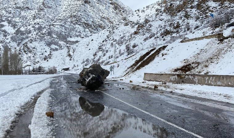 Van'ın Çatak ilçesinde dün akşam saatlerinde etkili olan kar yağışı hayatı olumsuz etkilerken, ilçeye 5 kilometre uzaklıktaki Kanispi mevkiinde yamaçlardan kopan dev kayalar yola düştü.
