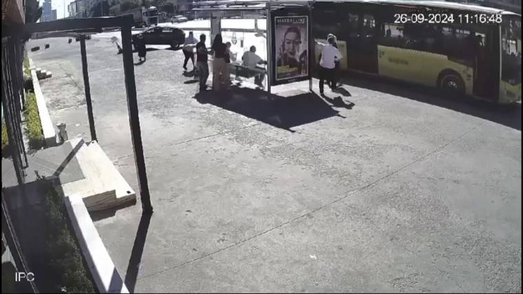 Ardından otomobilin otobüs durağına daldığı, durakta bekleyen vatandaşların korkuya kapılarak kaçtığı, kaçarken 2 vatandaşın yere düştüğü görülüyor. Korku dolu anlar güvenlik kamerasına saniye saniye yansıdı.