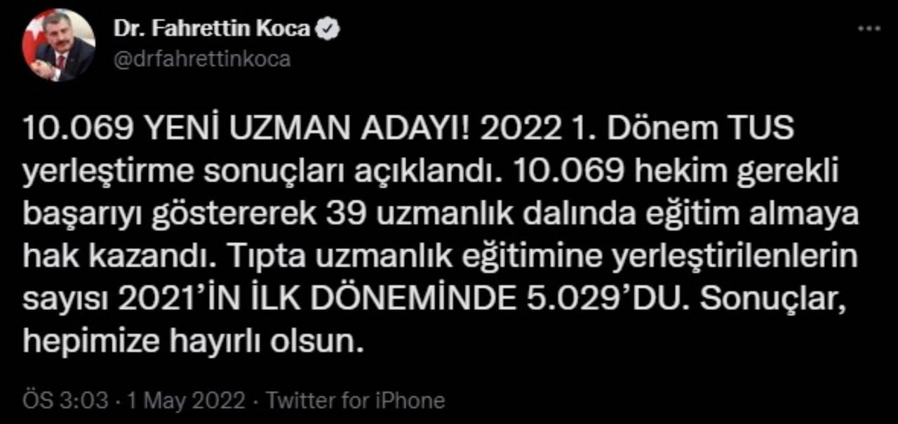 "2022 1. Dönem TUS yerleştirme sonuçları açıklandı. 10 bin 69 hekim gerekli başarıyı göstererek 39 uzmanlık dalında eğitim almaya hak kazandı. Tıpta uzmanlık eğitimine yerleştirilenlerin sayısı 2021'in ilk döneminde 5 bin 29'du. Sonuçlar, hepimize hayırlı olsun."