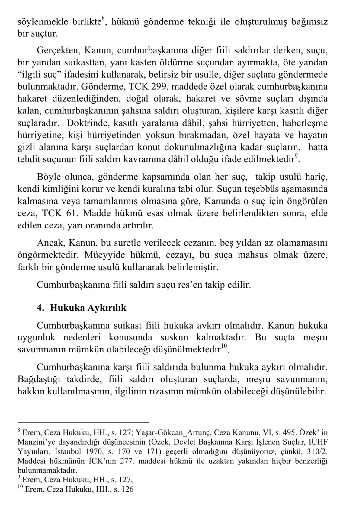 Türk Ceza Kanunu’nun 310. maddesi, “Cumhurbaşkanına suikast ve fiilî saldırı” suçunu düzenliyor. Maddenin ikinci fıkrasına göre, bu suça teşebbüs veya hazırlık hareketleri de cezalandırılabilir. Ancak hukukçulara göre bu madde, yalnızca fiziksel eylemleri kapsıyor. Basın yoluyla yapılan sözlü açıklamaların “fiilî saldırı” kapsamında değerlendirilmesinin mümkün olmadığı belirtiliyor.