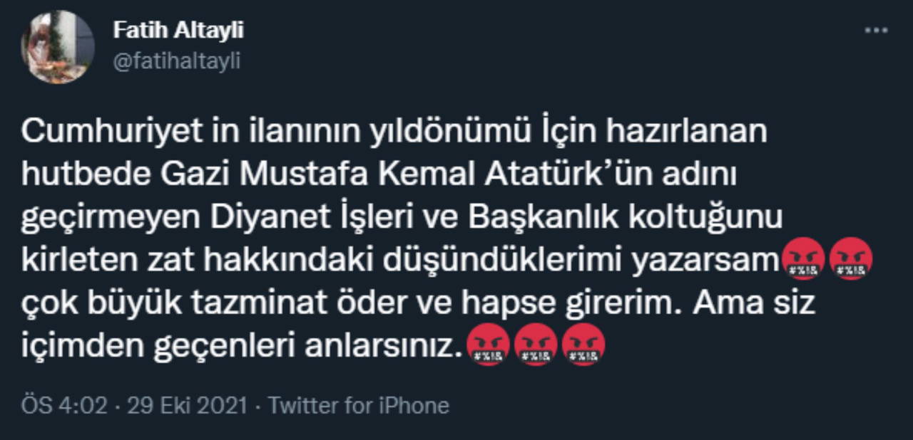 "Diyanet İşleri ve başkanlık koltuğunu kirleten zat hakkındaki düşündüklerimi yazarsam çok büyük tazminat öder ve hapse girerim" ifadelerini kullanan Altaylı, "Ama siz içimden geçenleri anlarsınız" diye yazdı.