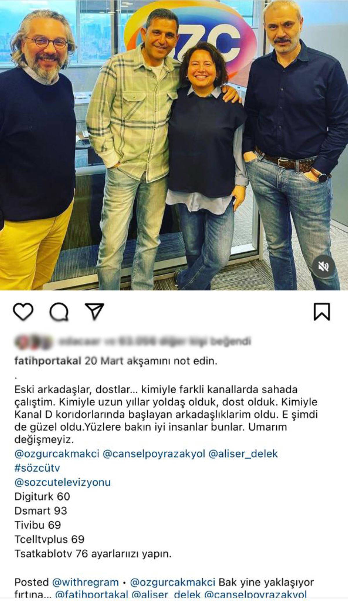 Fotoğraf paylaşan Portakal, "20 Mart akşamını not edin. Eski arkadaşlar, dostlar... Kimiyle farklı kanallarda sahada çalıştım. Kimiyle uzun yıllar yoldaş olduk, dost olduk. Kimiyle Kanal D koridorlarında başlayan arkadaşlıklarım oldu. E şimdi de güzel oldu. Yüzlere bakın iyi insanlar bunlar. Umarım değişmeyiz" notunu düştü.