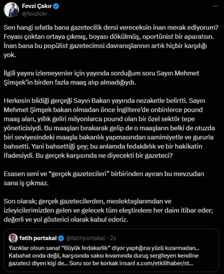 Gerçekleştirilen yayınla ilgili Fatih Portakal bir paylaşım yaptı ve Çakır'a "Soru sor be korkak insan!" dedi. Bunun üzerine Çakır'dan sert bir cevap geldi.