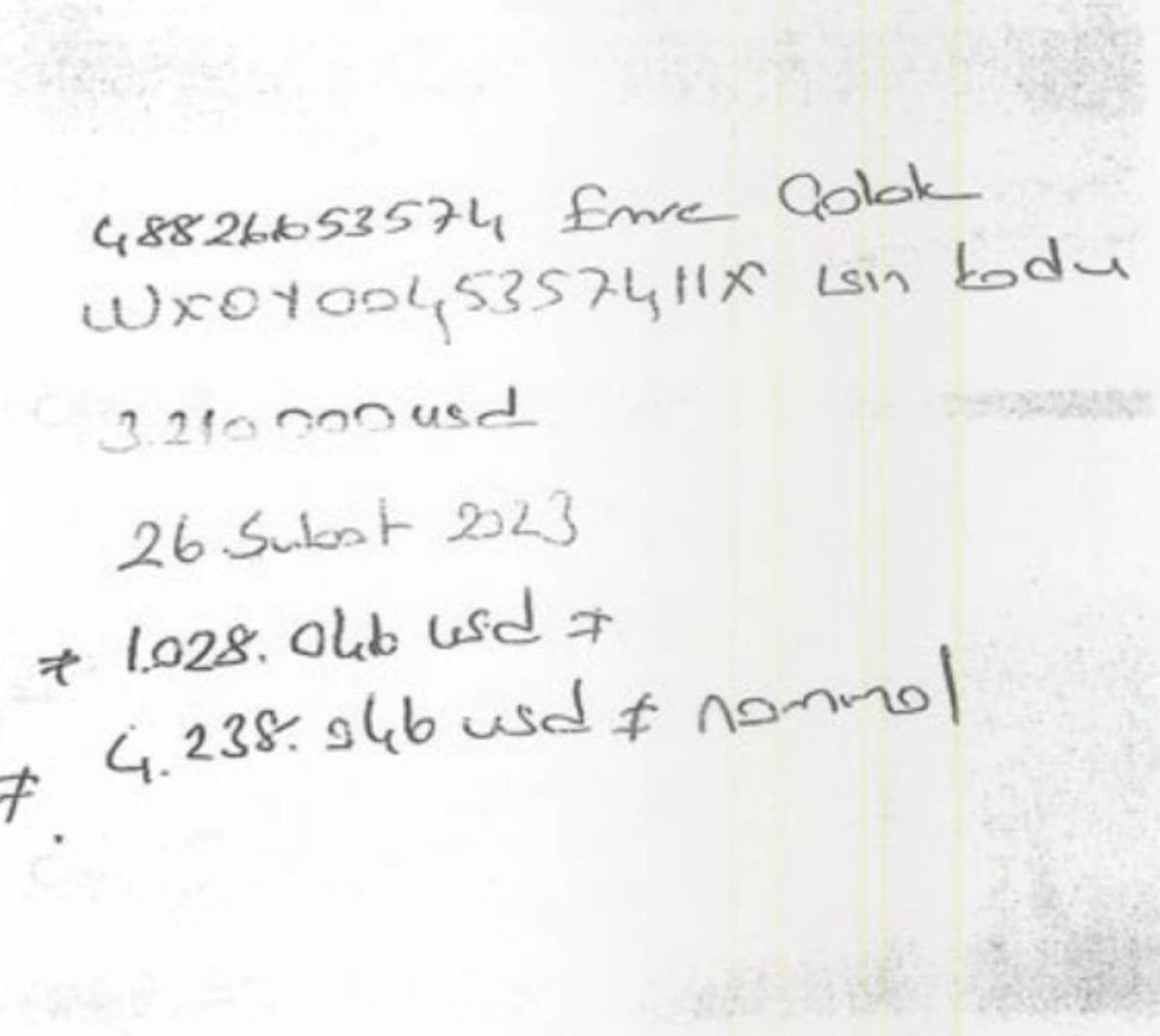 Karşılığında hiçbir belge almadı. Daha sonra Seçil Erzan, Emrah Çolak’a el yazısı olan bir kağıt parçası verdi. Bankacılık kodları olan kağıtta '3 milyon 210 bin dolar. 26 Şubat 2023. 1 milyon 28 bin dolar. 4 milyon 238 bin dolar nominal”' yazılmıştı. Yani Emre Çolak’ın 3 milyon 210 bin dolarına bir ayda 1 milyon 28 bin dolar faiz alacağı vaat edilmişti. Emre Çolak’ın avukatı suç duyurusuna Seçil Erzan’ın el yazısı bulunan bu kağıdı ekledi. Emre Çolak, 3 milyon 210 bin dolar verdiğini ve paranın tamamının gittiğini ifade etti."