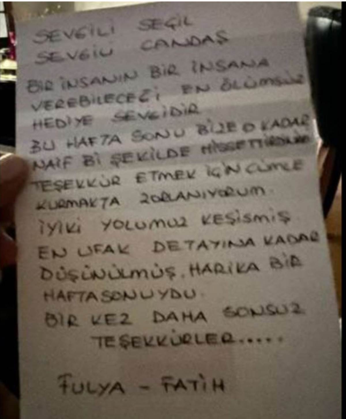 Söz konusu notta şu ifadeler yer aldı: "Sevgili Seçil, sevgili Candaş. Bir insanın bir insana verebileceği en ölümsüz hediye sevgidir. Bu hafta sonu bize o kadar naif bir şekilde hissettirdiniz ki teşekkür etme için cümle kurmakta zorlanıyorum. İyi ki yolumuz kesişmiş. En ufak detayına kadar düşünülmüş harika bir hafta sonuydu. Bir kez daha sonsuz teşekkürler."