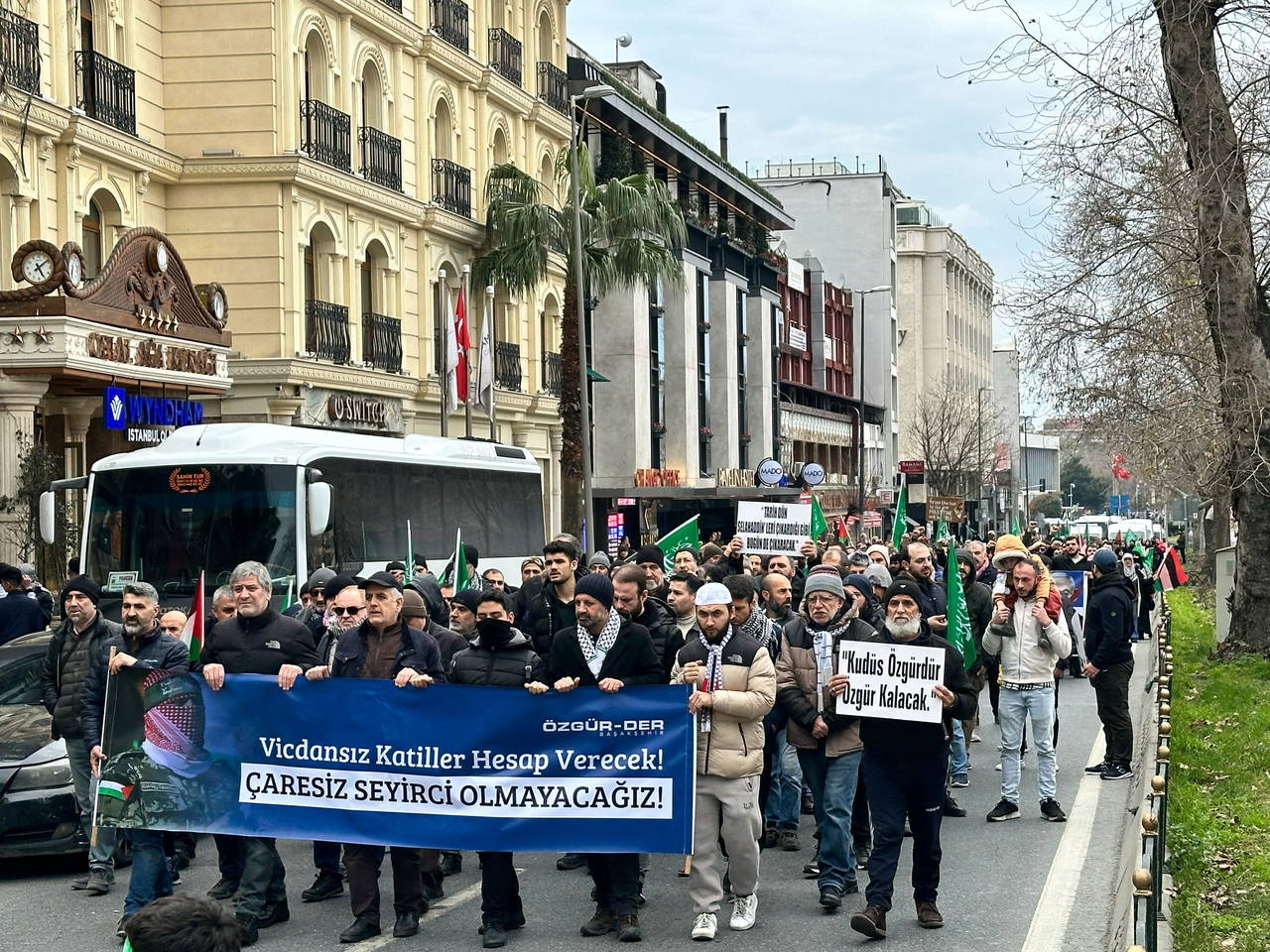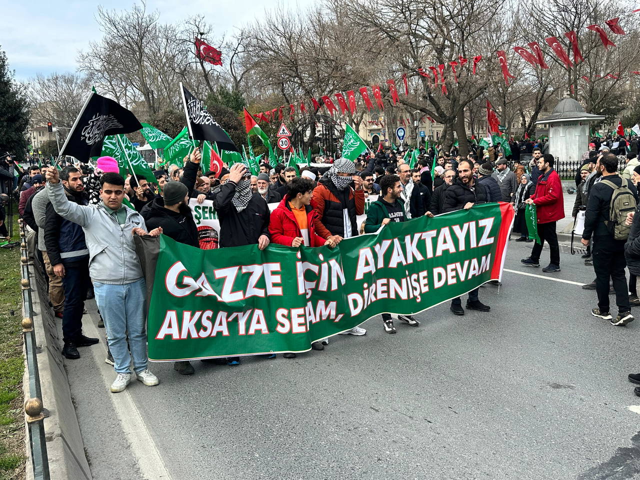 Grup Türk bayrakları, Filistin bayrakları ve sloganlar eşliğinde Beyazıt Meydanı!na yürüyüşüne devam ediyor.