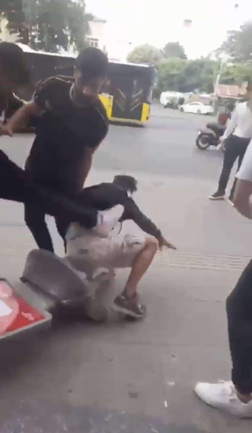 O sırada olayı gören çevredekiler, köpeğine şiddet uygulamaya çalışan kişiyi darbetti. O anlar güvenlik kameralarına yansıdı.