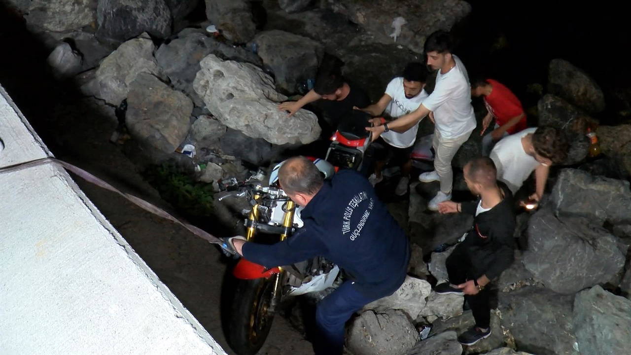 Kaza sonrası kayalıklara uçan motosiklet de polis ekipleri ve vatandaşların yardımıyla kayalıklardan çıkarıldı. Polis, kaza ile ilgili inceleme başlattı.