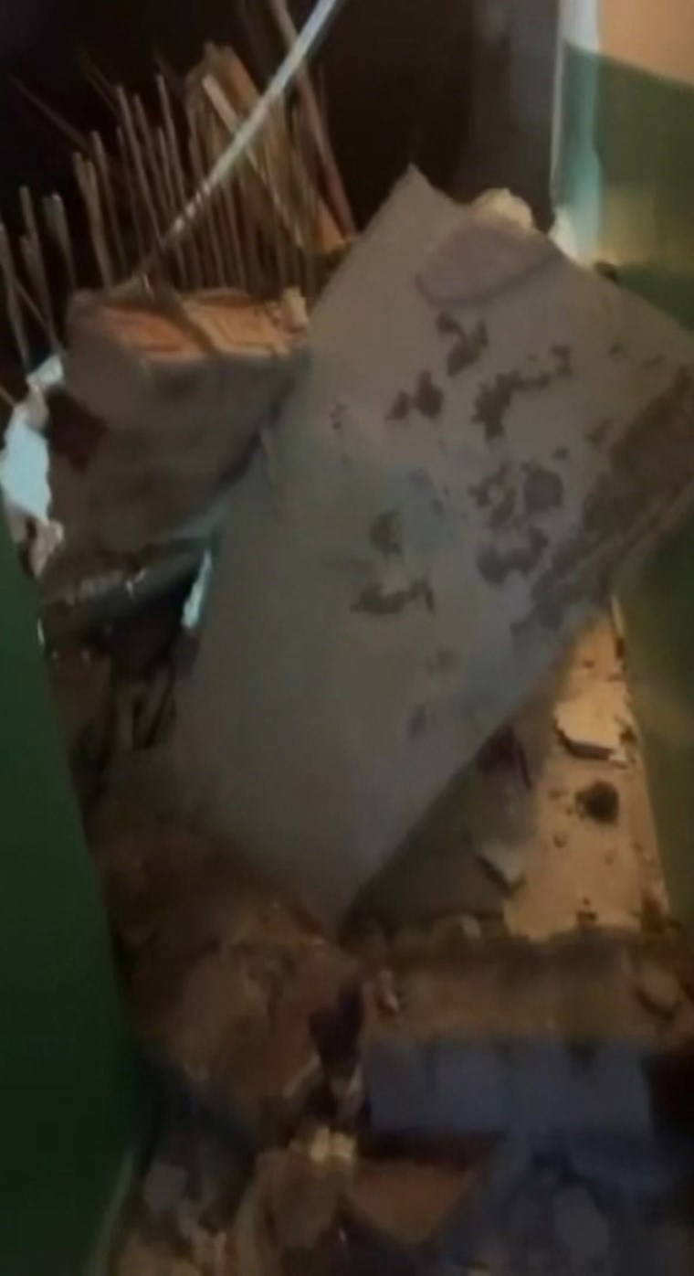 Sesleri duyan apartman sakinleri dairelerinden çıktıklarında merdiven boşluğundaki duvarın yıkıldığını ve dairelerde çatlaklar oluştuğunu gördü.