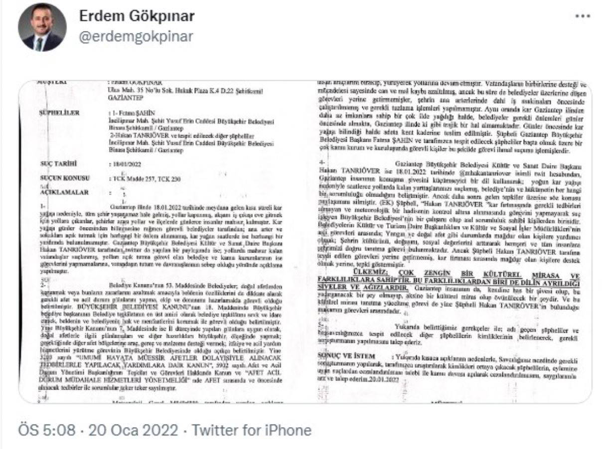 CHP Gaziantep İl Hukuk Komisyonu Başkanı avukat Erdem Gökpınar sosyal medya hesabından, Fatma Şahin ve Hakan Tanrıöver hakkında suç duyurusunda bulunduğunu paylaştı. Şahin’in halkın mağdur olmasına yol açtığının belirtildiği dilekçede, Tanrıöver’in ise halkın şivesini aşağıladığı belirtilerek cezalandırılmaları istendi.