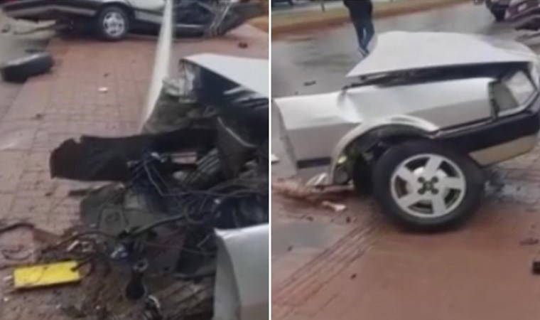 Şiddetli bir şekilde yol kenarında bulunan aydınlatma direğine çarpan otomobil ikiye bölündü. Otomobilin çarptığı aydınlatma direği aracın üzerine düşerken otomobilin sürücüsü yaralandı.