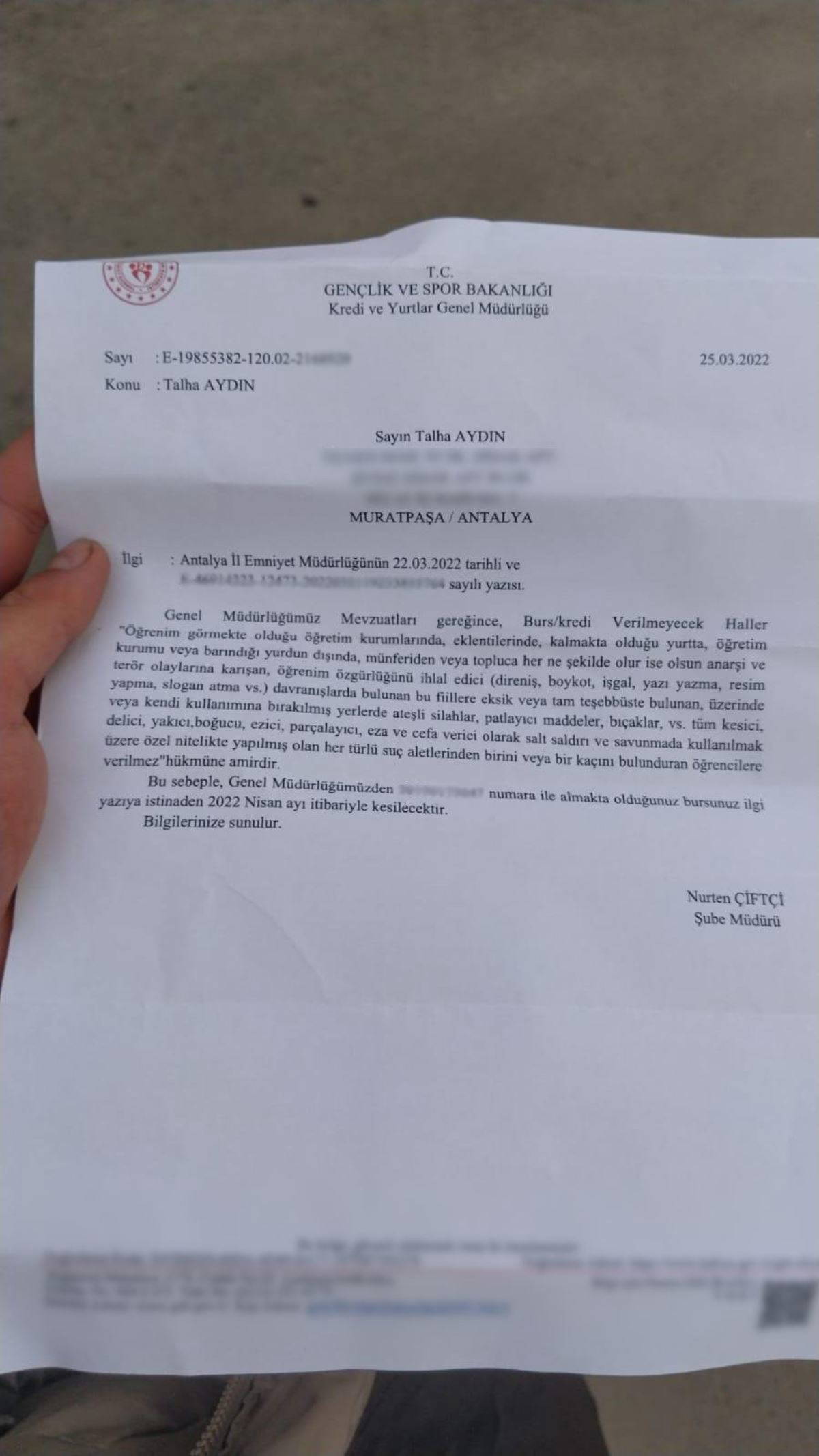Antalya'da Akdeniz Üniversitesi öğrencisi Merih Talha Aydın’ın Kredi Yurtlar Kurumu’ndan (KYK) aldığı öğrenim kredisi, “Anarşi ve terör olaylarına karıştığı, öğrenim özgürlüğünü ihlal edici davranışlarda bulunduğu” gerekçesiyle kesildi.