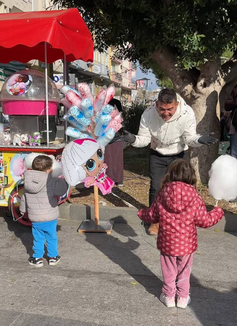 Tezgahının önüne park edip, üzerine 'Ferdi Tayfur'un ruhuna çocuklara taze pamuk şeker bedava' yazdığı otomobilden de Ferdi Tayfur şarkıları çalan Sait Kocakaya, sanatçının hayrına özellikle çocuklara pamuk şeker verdi.