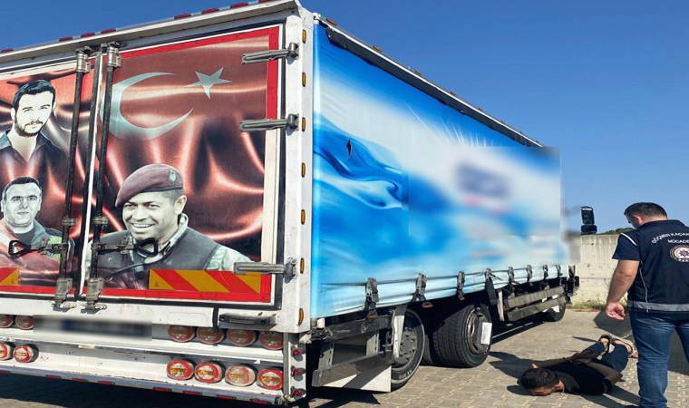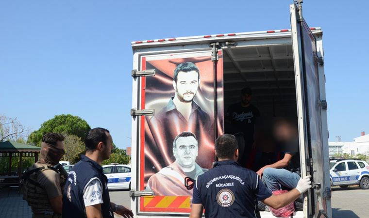 Üzerinde şehit polis memuru Fethi Sekin, astsubay Ömer Halisdemir ile Ege Üniversitesi’nde öldürülen öğrenci Fırat Yılmaz Çakıroğlu’nun fotoğraflarının resmedildiği kamyonette 67 kaçak göçmen yakalandı, sürücü F.S.G., gözaltına alındı.