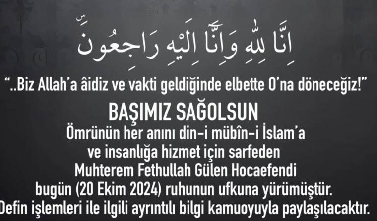 “Ömrünün her anını din-i mübiîn-i İslam’a ve insanlığa hizmet için sarfeden Muhterem Fethullah Gülen Hocaefendi bugün (20 Ekim) ruhunun ufkuna yürümüştür. Defin işlemleri ile ilgili ayrıntılı bilgi kamuoyu ile paylaşılacaktır.”