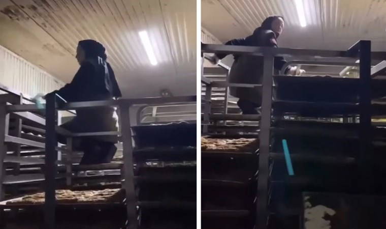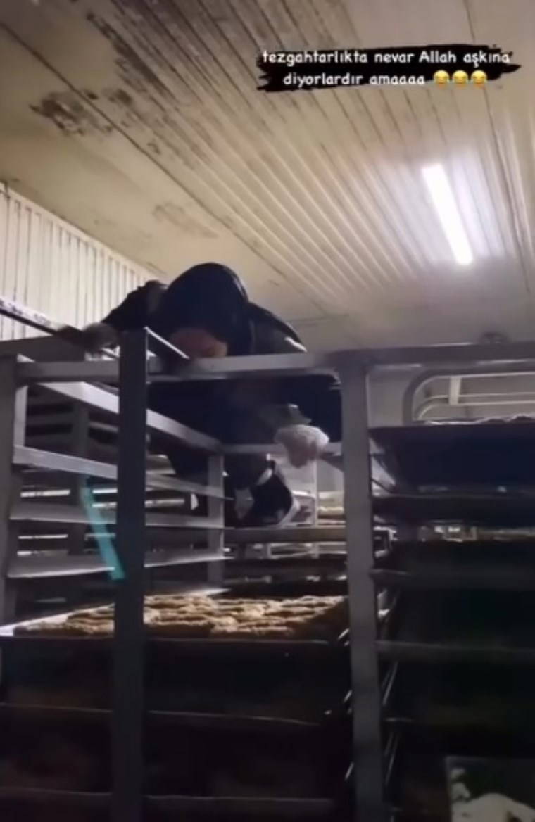 Mergiç Mahallesi'ndeki bir fırında tezgahtar olarak çalışan kadın, pişmeye gidecek olan üzerleri açık kurabiyelerin bulunduğu tepsilerin takılı olduğu rafların üzerine çizmeleriyle bastı.